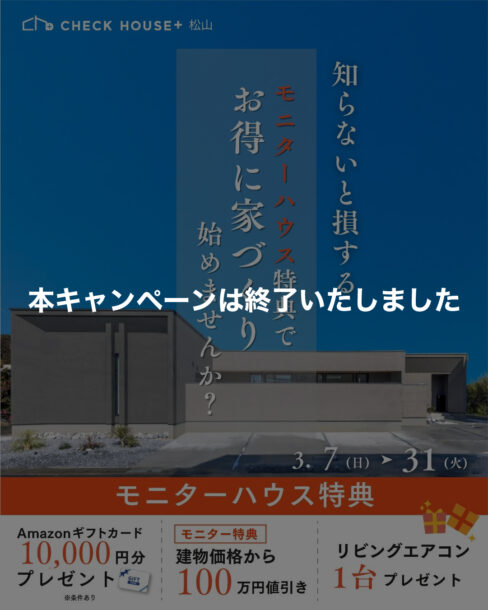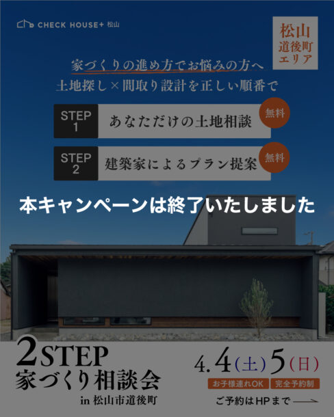 イベント情報 チェックハウスプラス 松山 CATEGORY カテゴリー イベント情報 チェックハウスプラス 松山 2026. 04.01 【はじめての平屋相談会】WEB来場予約キャンペーン 2026. 03.25 【4月開催】2STEP家づくり相談会 2026. 02.25 【モニターハウス】オーナー様大募集