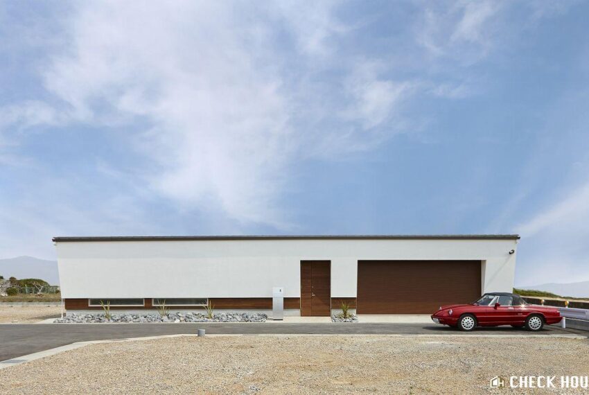 - 中庭を直線の”ロ”の字で囲んだリゾートの平屋建て。曲線の美しいランボルギーニのためのビルトインガレージ。